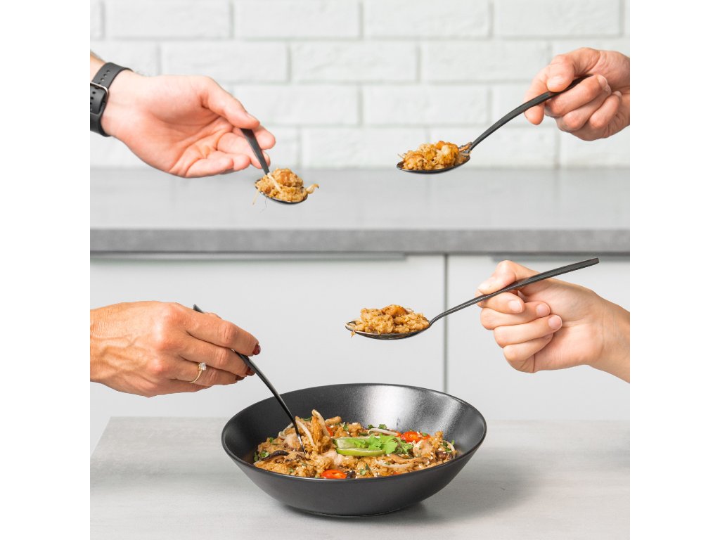Voňavá basmati ryža smažená podľa thajskej receptúry s kúskami kuracieho mäsa, vajcami, mungo klíčkami, shitake hubami a zeleninou, dochutená červenou karí pastou a limetkou.