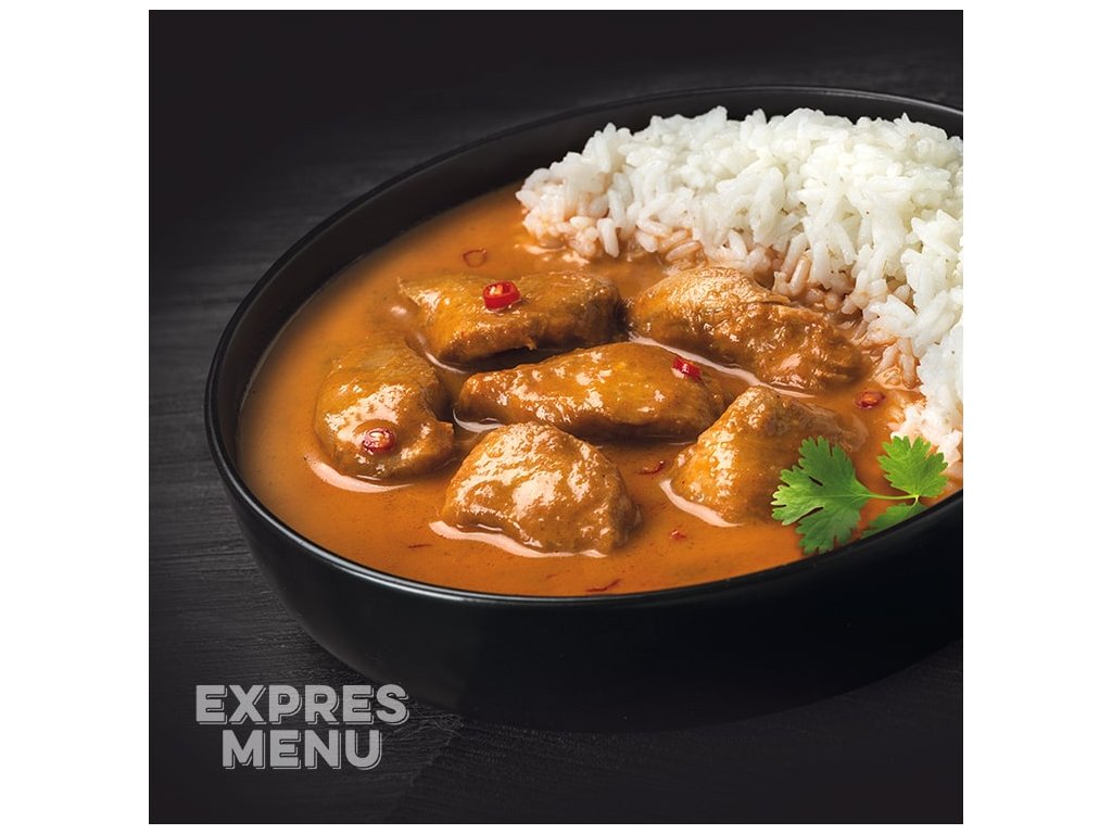 Intenzívny chuťový zážitok z Thajska Vám dopraje pikantná omáčka so šťavnatými kúskami kuracích pŕs, s kokosovým mliekom, karí, koriandrom, citrónovou trávou a limetkou. Pokrm je doplnený jazmínovou ryžou.